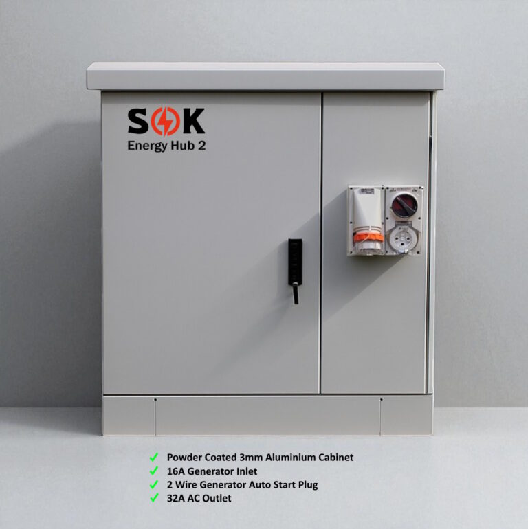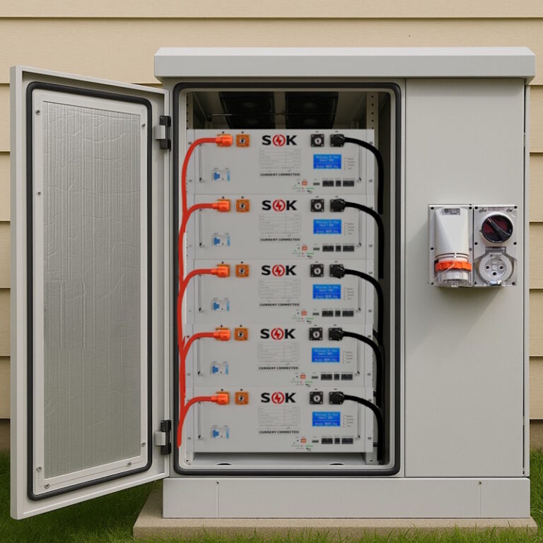 10 – 25 kWh capacity, compatible with 2 – 5 SOK rack batteries (Grade A LiFePO₄).